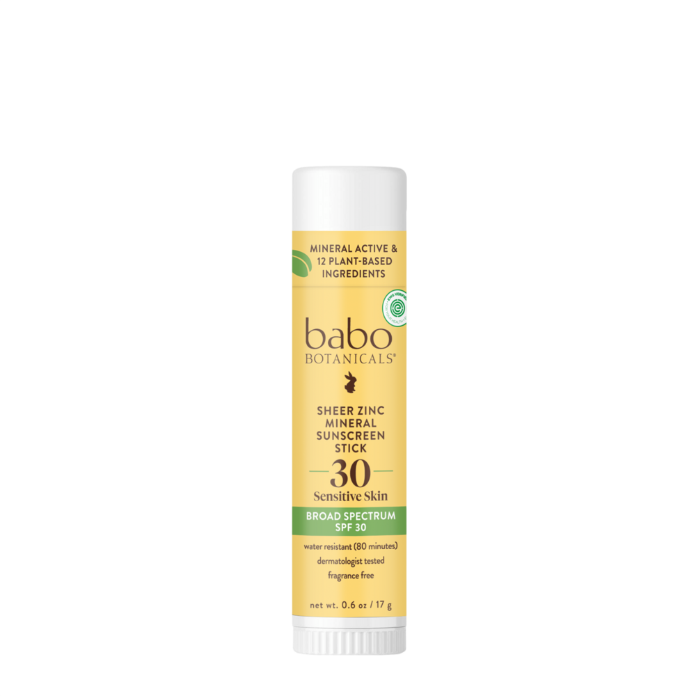 Babo's broad spectrum UVA/UVB zinc sunscreen stick is great for the face, lips, nose, ears and anywhere with extra sensitive skin. The fragrance-free sunscreen stick goes on clear, is non-greasy and rubs in well. Babo's hypoallergenic formula contains the power-packed protection of Zinc, plus rich, skin-soothing certified organic oils, including Jojoba.