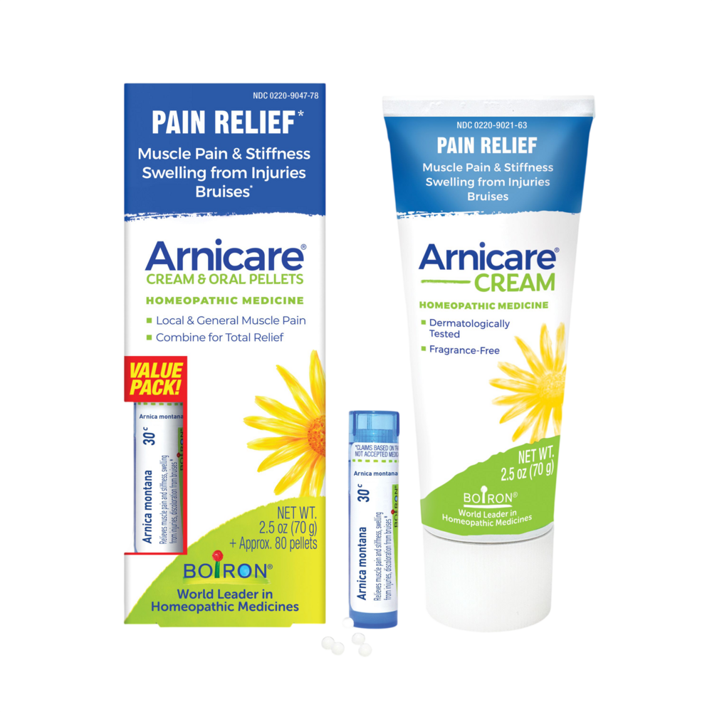 Suggested Use/Directions: Arnicare Cream: Apply a thin layer of Arnicare Cream to affected area and massage gently as soon as possible after minor injury. Repeat 3 times a day or as needed. If heat or ice is applied, wait 5 minutes before applying Arnicare Cream. Arnica 30C Pellets: At the onset of symptoms, dissolve 5 pellets under the tongue 3 times a day until symptoms are relieved or as directed by a doctor.