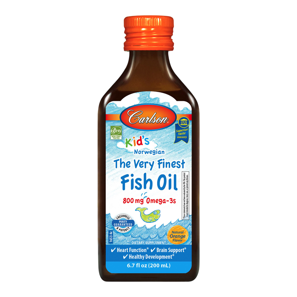 Kid's Norwegian The Very Finest Fish Oil™ in orange flavor has received numerous awards for its taste and quality. To ensure maximum freshness, Kid's The Very Finest Fish Oil™ is closely managed from sea to store. Carlson Labs sources the highest quality, deep, cold-water fish using traditional, sustainable methods. Kid's The Very Finest Fish Oil™ is then bottled with a touch of antioxidants and is given a nitrogen flush to remove oxygen and help prevent oxidation. Each 1/2 teaspoon of Kid's The Very Finest Fish Oil™ provides 800 mg of omega-3s, including EPA and DHA, which support heart, brain, vision, and joint health.* Like all Carlson omega-3s freshness, potency, and purity are guaranteed. • Promotes healthy development, and heart and brain function* • 800 mg of omega-3s per 1/2 teaspoonful • Wild caught and sustainably sourced • IFOS and IGEN non-GMO certified • Freshness, potency, and purity guaranteed