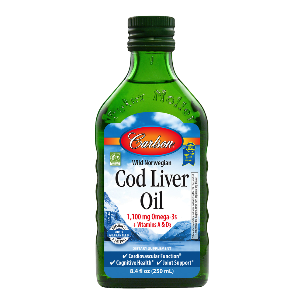 Carlson Cod Liver Oil has received numerous awards for its taste and quality. A single teaspoonful provides 1,100 mg of omega-3s, including EPA and DHA, which support heart, brain, vision, and joint health.* To ensure maximum freshness, Cod Liver Oil is closely managed from sea to store. Carlson Labs sources the highest quality Arctic cod off the coast of Norway using traditional, sustainable methods. The same day they're caught, the cod are transported to a highly regulated Norwegian facility for processing and purification. Carlson Cod Liver Oil is bottled with a touch of vitamin E and is given a nitrogen flush to remove oxygen and to prevent oxidation. Like all Carlson omega-3s, freshness, potency, and purity are guaranteed. Carlson Cod Liver Oil is available in lemon, fruit splash, or natural flavor. • Promotes cardiovascular, cognitive, and joint function* • 1,100 mg of omega-3s per teaspoonful + vitamins A and D3 • Wild caught, sustainably sourced Norwegian Arctic cod • IFOS and IGEN non-GMO certified • Freshness, potency, and purity guaranteed