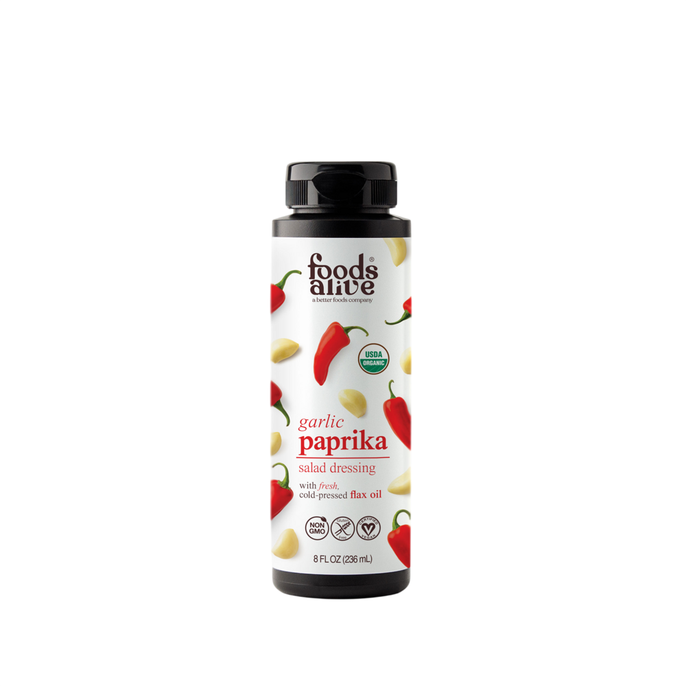 Other Ingredients: Unrefined gold flax oil*, filtered water, apple cider vinegar*, maple syrup*, garlic powder*, paprika powder*, Himalayan pink salt, mustard powder*, black pepper*.