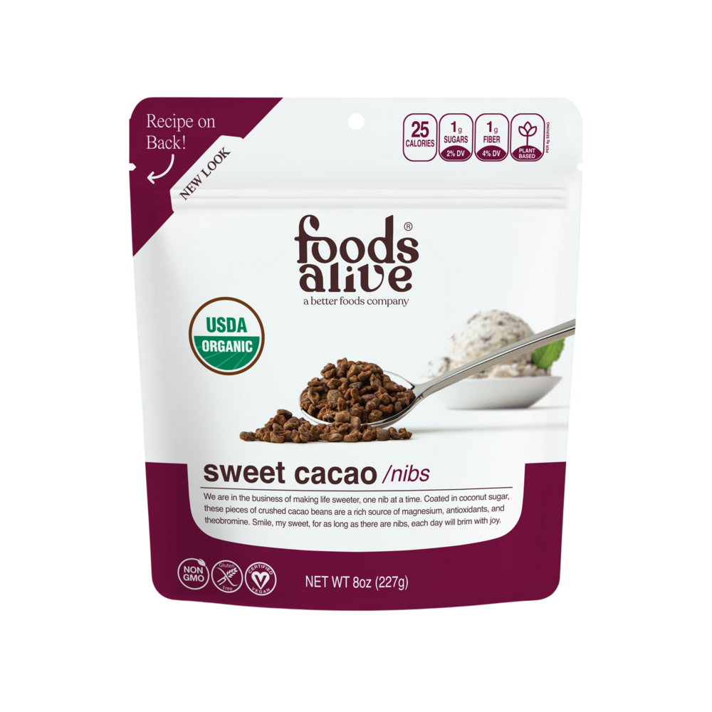 Food's Alive sweetened cacao nibs are versatile and nutrient-dense. They are created by crushing cacao beans into small pieces then lightly coating them with sweet organic coconut palm sugar.