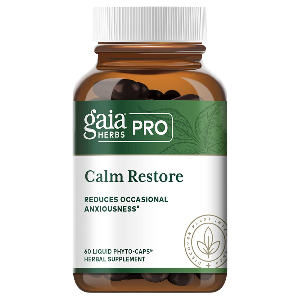Reduce Occasional Anxiousness* Moments of nervous stress and tension can interfere in the enjoyment of your day by disrupting the functioning of body and mind. _Calm Restore_ provides the support you need to help promote a sense of calm during times of peak stress.* Made with Passionflower, and fresh Skullcap from the Gaia Herbs farm, this herbal blend gives your nervous system the soothing support it deserves in stressful moments.*