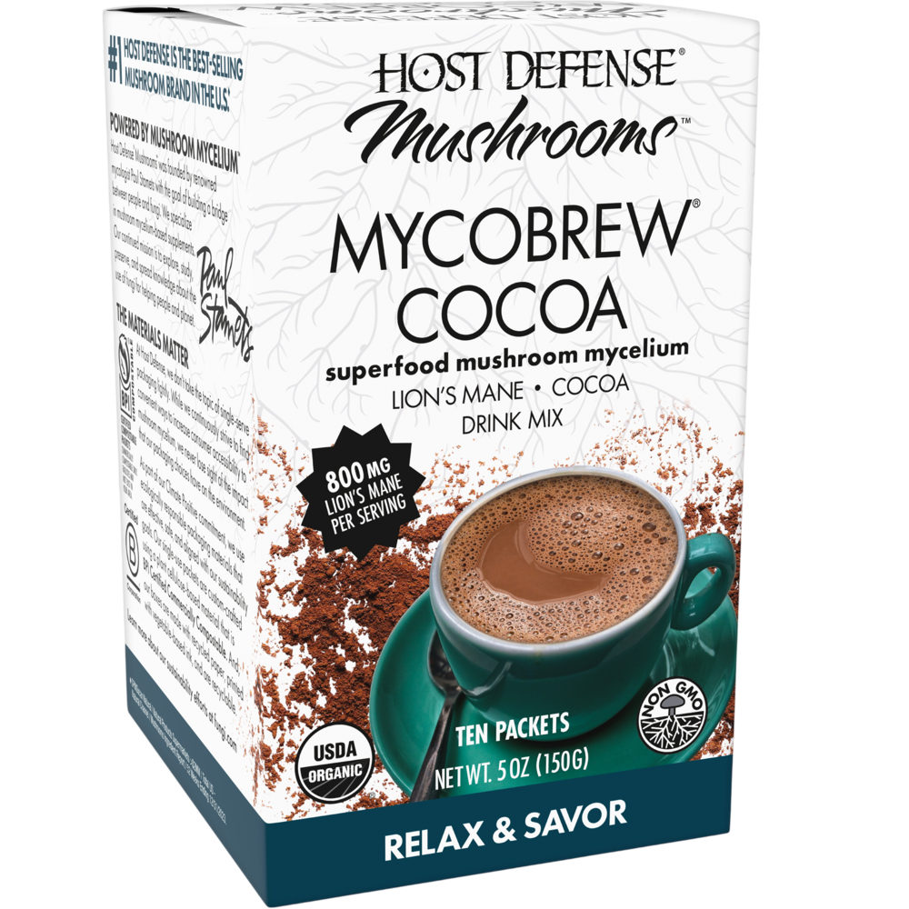 MYCOBREW™ COCOA is a superfood blend of organic Lion's Mane mushroom mycelium and Fair Trade Certified™ cocoa. This delicious, chocolaty tasting beverage, sweetened with coconut sugar, has subtle hints of toffee. Settle in with a hot mug, and top with marshmallows for a timeless treat. Convenient grab-n-go packets can be enjoyed after hitting the slopes, the trail, anytime, anywhere!