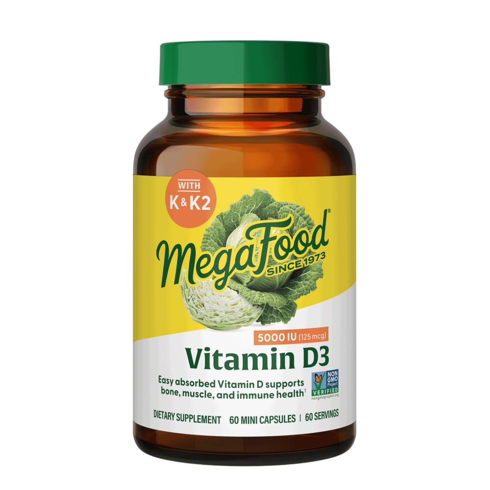 MegaFood Vitamin D3 5000 IU provides a blend of vitamins