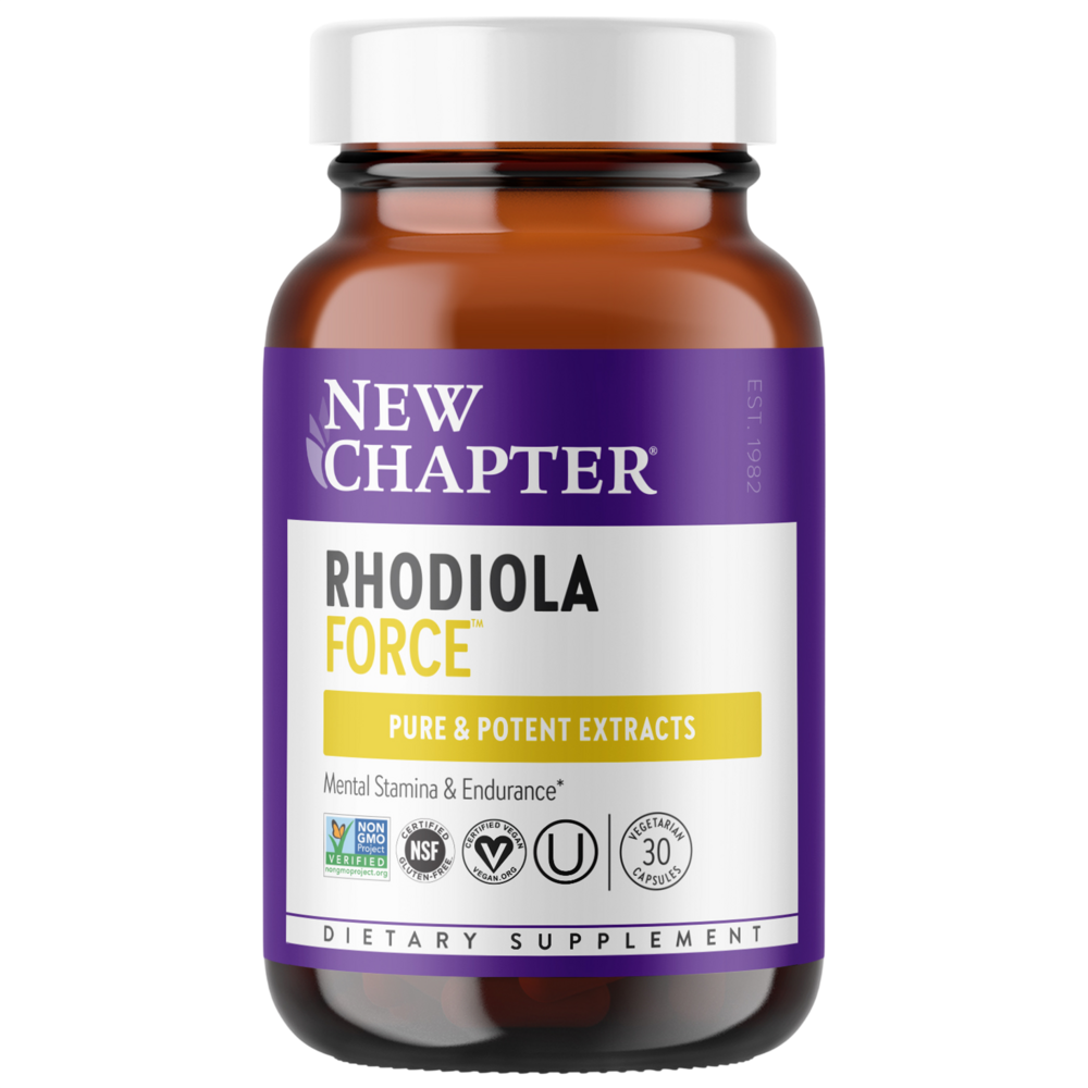 Mental Stamina & Endurance*.What is Rhodiola Force?Rhodiola Force is a one-daily source of potent Rhodiola rosea extract, an herbal stress adaptogen also called the "elixir of life.” New Chapter® Rhodiola is different because it’s expertly formulated with a whole-food approach to deliver a full spectrum of Rhodiola's pure, beneficial compounds. Our Certified Vegan formula delivers 300 mg of potent Rhodiola per capsule, gently concentrated from 2550 mg of high quality, sustainably sourced Rhodiola root.What does Rhodiola do?Rhodiola is a revered adaptogen, meaning it helps body and mind adapt to occasional stress. How? Rhodiola helps to modulate and shift your body’s stress response, thereby uplifting mood.* Rhodiola supports mental focus, stamina, energy and endurance—even under stressful conditions like exertion and sleep disruption.*