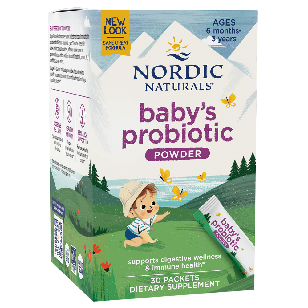 Baby's Probiotic Powder provides safe and effective support for the digestive and immune health of babies and toddlers ages 6 months to three years.* Featuring extensively studied probiotic strains Lactobacillus rhamnosus GG and Bifidobacterium animalis ssp. lactis, this odorless, unflavored powder comes in premeasured 1.5 gram packets that can be mixed into liquid (breast milk, formula, etc.) or soft foods for easy delivery.