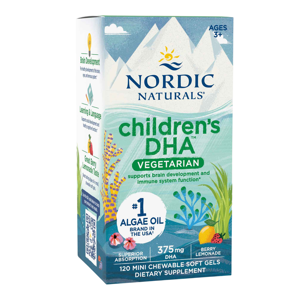 Children's dha vegetarian offers highly concentrated omega-3 dha from algae in chewable berry-lemonade soft gels. with 375 mg of dha per serving, these tasty. soft gels provide growing children with a vegetarian source of the important omega-3 dha they need for brain health and nervous system function.* sustainably sourced superior absorption plant based every batch of nordic naturals algae oil is tested by a third-party certified lab for environmental toxins, including heavy metals. the algae oil is in the triglyceride form and surpasses the strictest international standards for purity and freshness. suggested use: for ages 3+, three soft gels daily, with food, or as directed by your health care professional. soft gels can be chewed or swallowed.