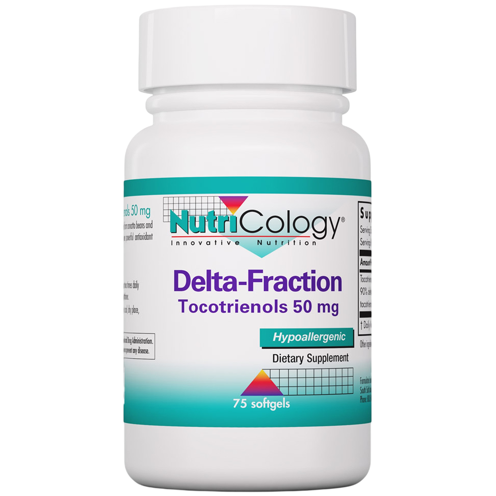 Nutricology Delta-Fraction Tocotrienols 50 mg. contains tocotrienols from annatto beans and is free of tocopherols. Tocotrienols have more powerful antioxidant activity than tocopherols, and delta-tocotrienol is the strongest of the four tocotrienols. Delta-Fraction Tocotrienols contains delta and gamma-tocotrienols. Along with tocopherols, tocotrienols are part of the vitamin E family. They are important oil-soluble antioxidants, crucial to the protection of fats, oils, and cell membranes against free radical damage. Free radicals are reactive oxygen compounds generated by our normal biological processes and by exposure to ultraviolet radiation, pollution, cigarette smoke and other environmental and biological stress factors. High levels of free radicals can break down cell membranes and damage cell DNA.