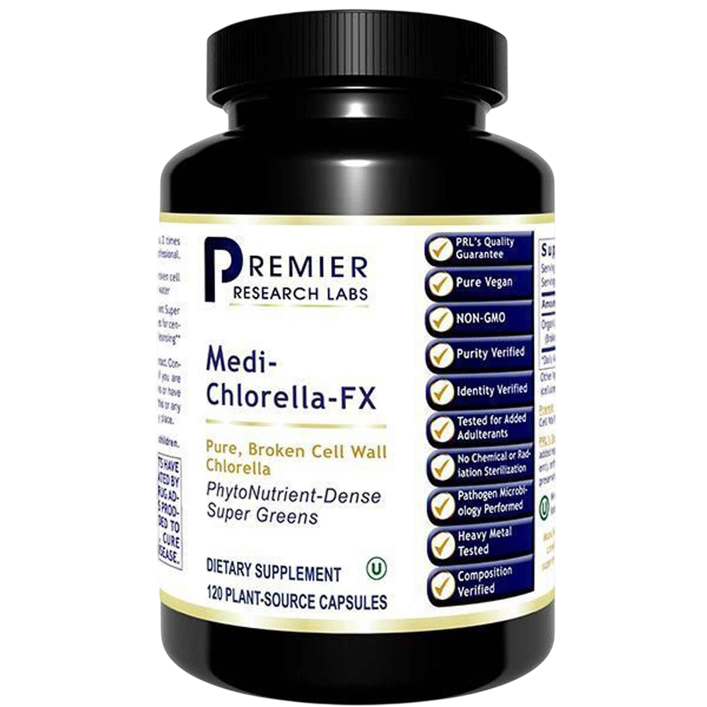 Medi-Chlorella-FX features organic chlorella, grown in fresh water (not in dark vats with tap water). This famous, ancient Super Nutrient was treasured by many cultures for centuries for optimal health and detox.*