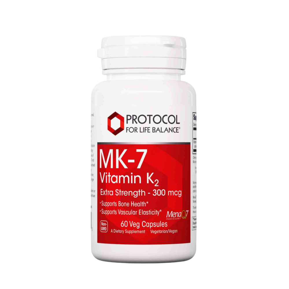Vitamin K is well known for its role in blood clotting, but has also been found to play an important role in normal bone formation and the preservation of bone strength.* Vitamin K2 more specifically is a significant regulator of tissue calcification and is critical for the maintenance of arterial elasticity and cardiovascular health.* Vitamin K2 includes two of the most studied subtypes, MK-7 (menaquinone-7) and MK-4 (menatetrenone). MK-7, the most readily absorbed and bioactive form of K2, has no common dietary sources.* Unlike vitamin K1, which is stored in the liver, MK-7 is transported directly to tissues and has a longer half-life than either K1 or MK-4.*