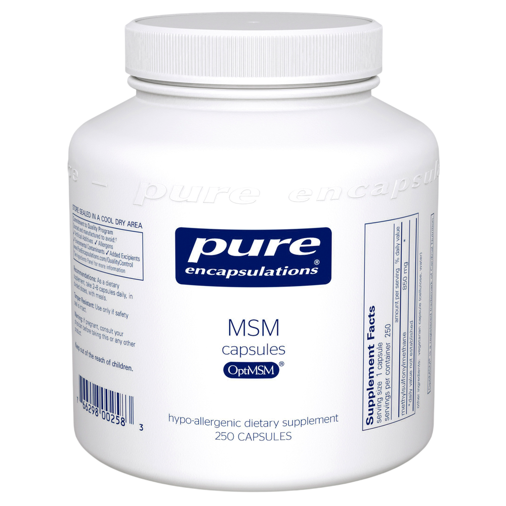 Pure Encapsulations' MSM (methylsulfonylmethane or dimethylsulfone) is a source of organic sulfur found naturally in the human body. MSM, the major metabolite of DMSO (dimethyl sulfoxide), is 34% elemental sulfur, a compound that is crucial in maintaining healthy tissues. While sulfur supports many functions, it is well known for maintaining connective tissue health. Sulfur also supports tissue containing significant amounts of collagen and keratin, including hair, skin, and nails. Sulfur is essential in methionine, cysteine and serum protein metabolism. Preliminary evidence suggests that MSM may also provide potential support for healthy immune and respiratory function.*