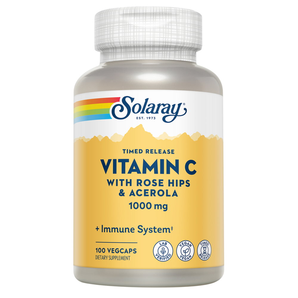 Solaray™ Vitamin C is formulated using a patent-pending, two-stage, timed-release concept. The vitamin C in Solaray Vitamin C is designed so that half is intended to be released immediately and the remaining vitamin C is intended to be gradually released over a 12 hour period. One capsule in the morning and another 12 hours later helps to extend the availability of vitamin C over a 24-hour period. Solaray Vitamin C provides antioxidant activity and is intended to provide nutritive support for normal, healthy collagen synthesis, cartilage and bone development, immune function, capillary and blood vessel integrity and nerve impulse transmission.*