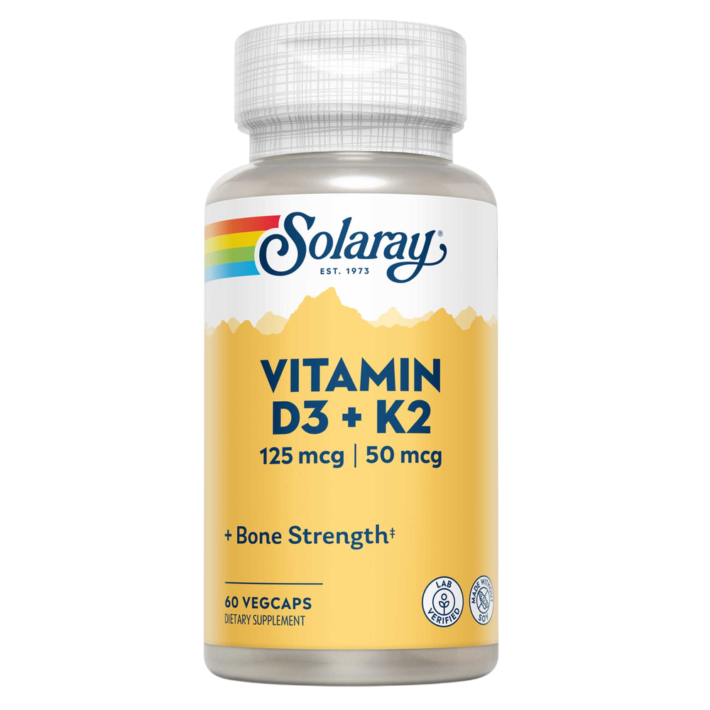 Solaray Vitamin D-3 & K-2 vegetarian capsules formula combines high-potency natural source D-3 Cholecalciferol with a clinically supported serving of K-2 Menaquinone-7 from natural source natto.