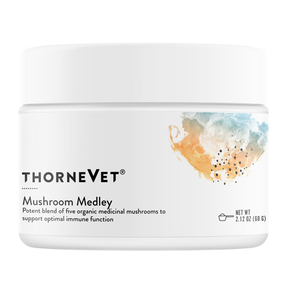 ThorneVet’s Mushroom Medley combines five organic, hot water-extracted medicinal mushrooms — Reishi, Turkey Tail, Cordyceps, Maitake, and Chaga. This synergistic blend of medicinal mushrooms provides robust support for balanced immune system function. The Mushroom Medley blend is ideal for supporting patients with weakened immune function, including providing support for patients undergoing treatment for cancer.