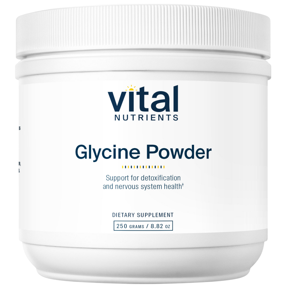 Glycine is an amino acid found in many protein food sources that helps support normal detoxification by serving as a precursor to Glutathione, a powerful intracellular antioxidant which is involved in both Phase I and II of liver detoxification.* Glycine also helps maintain a healthy nervous system and is used to support mild memory changes associated with aging.* It activates many receptors in the brain which promote neural development, learning, and cognition.* Glycine is a major inhibitory neurotransmitter which supports relaxation and healthy stress management.* Clinical research suggests that taking glycine before bedtime may promote sleep quality and modestly reduce feelings of fatigue.* It should not be taken with clozapine.