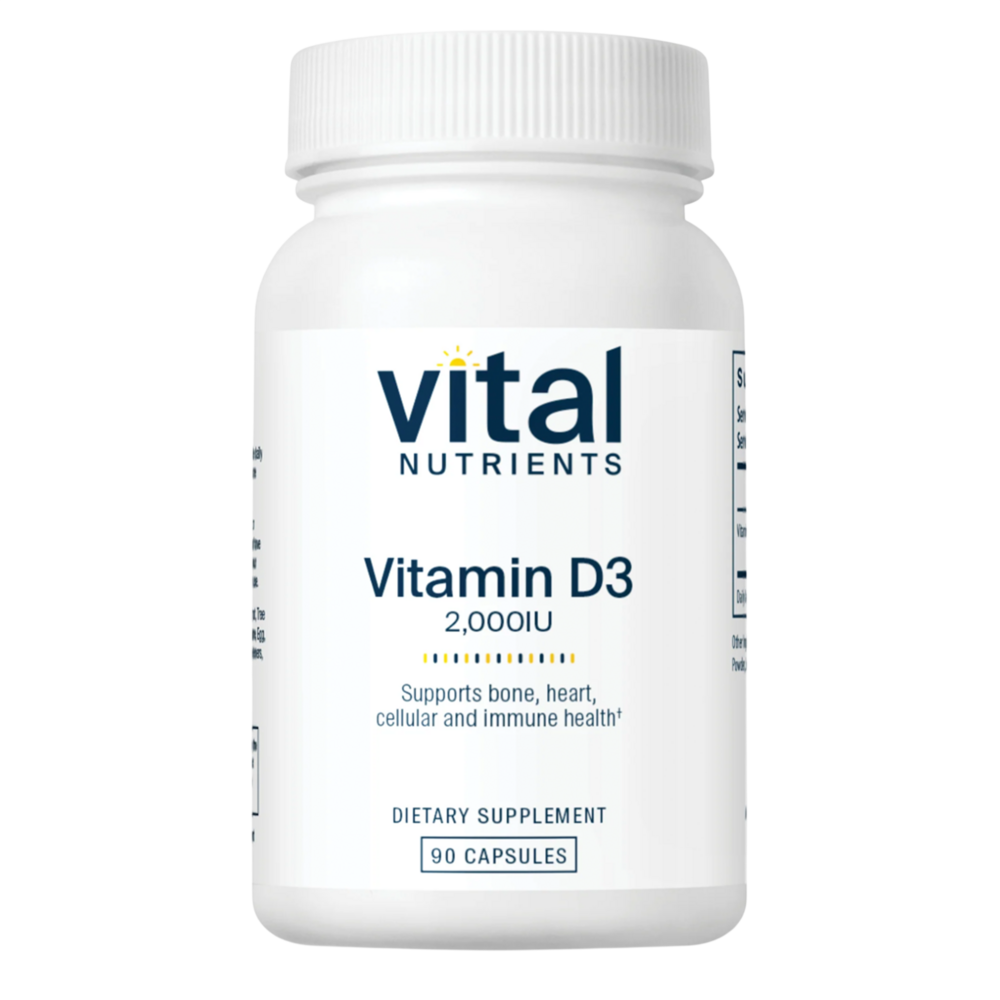 Supports calcium absorption and bone health.* Vitamin D3 is a fat-soluble vitamin that helps maintain strong bones and teeth by supporting healthy serum calcium levels.* It does this by promoting absorption of calcium in the digestive tract, as well as reducing calcium loss through urine.* Additionally, Vitamin D supports colon health, and may promote a healthy immune system.* Vitamin D occurs naturally in very few foods, and although it can be produced in the body, obtaining adequate skin absorption from sun exposure can be difficult year round.* Vital Nutrients offers supplemental Vitamin D in the active form D3 (also known as cholecalciferol).*